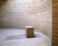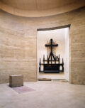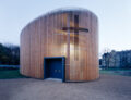 Über der freigelegten Kellertreppe, mit Resten der 1961 zugemauerten Tür, wurde die Nische für das erhalten gebliebene Altarbild errichtet. Diese neue Apsis verankert den Ovalraum in der Achsenrichtung des Altbaus. Die Hauptachse der neuen Cella folgt aber der Ost-West-Richtung, auf der auch der von Martin Rauch geformte Altar steht. Die Hülle aus Holzlamellen, die den Kernbau transluzent ummantelt, orientiert sich axial auf die Bernauer Straße.
