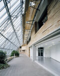 In einer 180m langen Galerie, die zugleich als Haupteingang dient, wirkt eine 6m hohe Stampflehmwand als Klimaregler und bildet einen gestalterischen Kontrast zu südorientierten Glasfassade. Der 1992 fertig gestellte Verbindungstrakt formt ein neues Entree zum Landeskrankenhaus und verknüpft es mit den flach ins Gelände eingebetteten Garagendecks im Süden sowie mit der Rotkreuz-Station, dem Labor- und Bürotrakt im Norden.