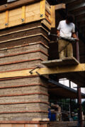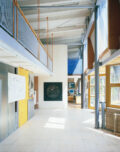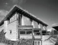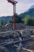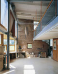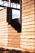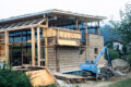 Sie trägt ein nach Süden aufgespreiztes Holzdach, überdeckt mit einer Grasschicht. Unter dem weit auskragenden Schirm wurden an drei Seiten die 55cm starken, 4m hohen Außenmauern in Stampflehmtechnik hochgezogen. Als Material diente das für den Keller ausgehobene Erdreich. Der Lehm wurde gesiebt, mit ca. 10% Ziegelsplitt erdfeucht vermischt und in Schalungen mechanisch verdichtet. Die vierte Außenwand wurde als leichte Holz-Glas-Struktur ausgeführt. Partiell mit Solarpaneelen und Trombe-Wänden ausgefacht, öffnet sie das Gebäude kammartig zur Sonne und verzahnt es mit der anschließenden, gedeckten Arbeitsterrasse.