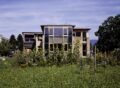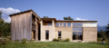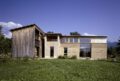Auf die im Grundriss stark gegliederten, mit großen Öffnungen durchbrochenen Wände ist das Obergeschoss in einer Holzständerkonstruktion aufgesetzt. Diese ist mit Leichtlehm ausgefacht und mit Lehm verputzt. Lehm vom Grundstück wurde zusätzlich als Füllmaterial der Zwischendecke sowie für verschiedene Ausbaudetails eingesetzt.